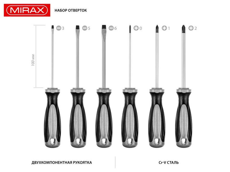 Набор отверток MIRAX 25186, закаленный стержень, двухкомпонентная рукоятка, в коробке, 6 предметов