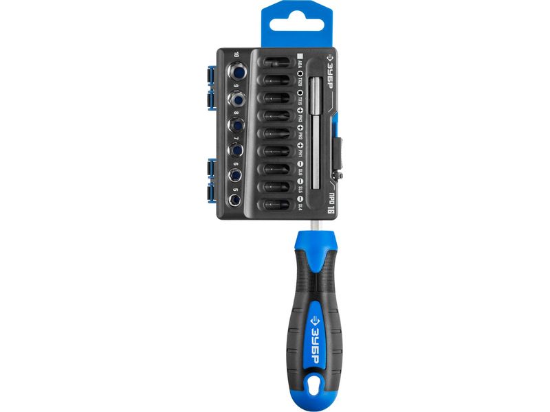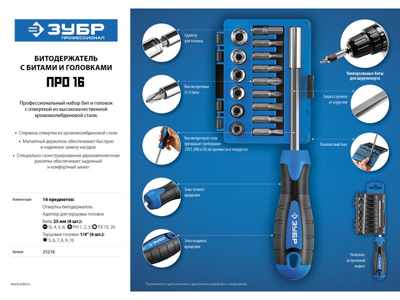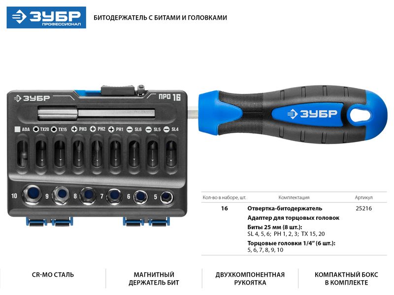 ПРО 16 Набор: Битодержатель с битами и головками, Cr-V сталь, двухкомпонентная рукоятка, в блистере, 16 предметов, ЗУБР Профессионал