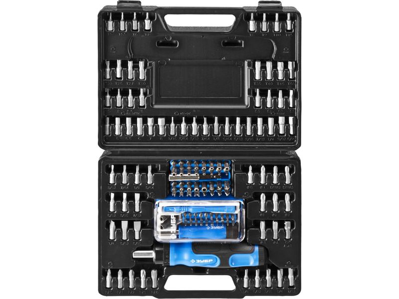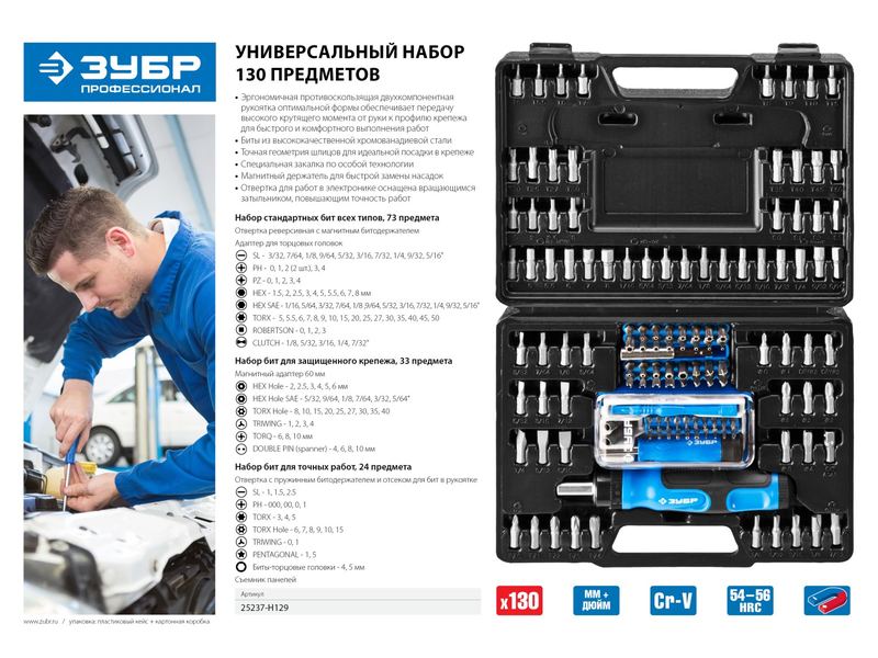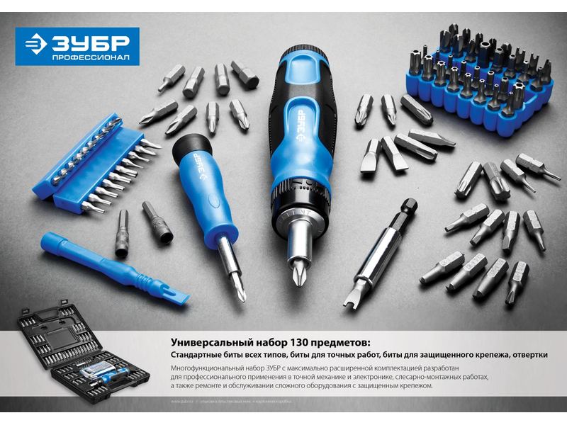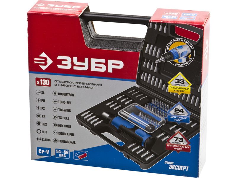 Набор ЗУБР "ЭКСПЕРТ": Отвертка реверсивная с магнитным битодержателем и отсеком для бит в рукоятке, Cr-V, 130 предметов