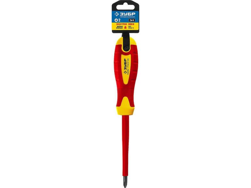 Отвертка диэлектрическая до 1000В, ЗУБР "ПРОФЕССИОНАЛ" "ПРОФИ ЭЛЕКТРИК" 25262-2-100, Cr-V, трехкомпонент рукоятка, PH 2 x 100 мм