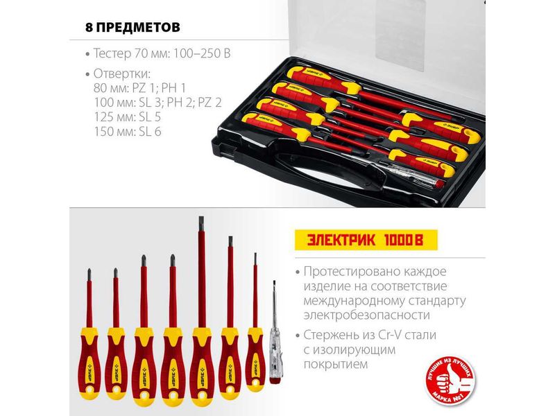 Набор: Отвертки SL 3, 5, 6 / PH 1, 2 / PZ 1, 2, тестер 100-250 В, ЗУБР "ПРОФЕССИОНАЛ" 25268, в кейсе, 8 предметов-20