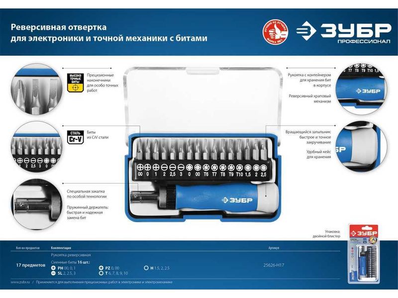 Купить Набор ЗУБР Отвертка "ЭКСПЕРТ" для точных работ, реверсивная рукоятка, CR-V, сменные биты, 16шт, 17предметов