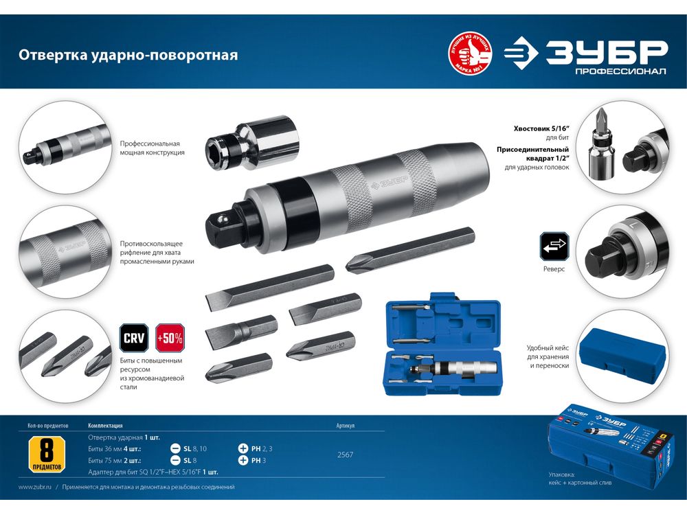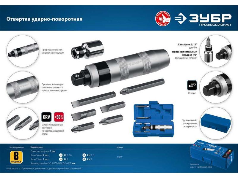 Профессионал отвертка ударно-поворотная 8 предм., ЗУБР |