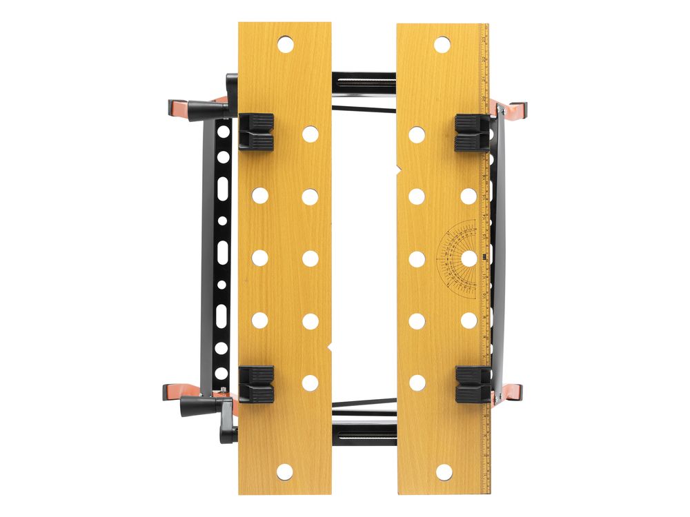 Удобная эксплуатация — верстак снабжен 4 съемными упорами, которые устанавливаются в различных позициях, а на столешнице имеется разметка с линейкой и транспортиром.
