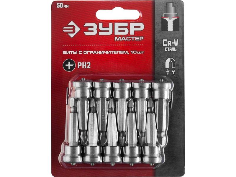 Бита ЗУБР "МАСТЕР" Phillips, с ограничителем, 50 мм, тип хвостовика E 1/4", 10 шт в слайде-591