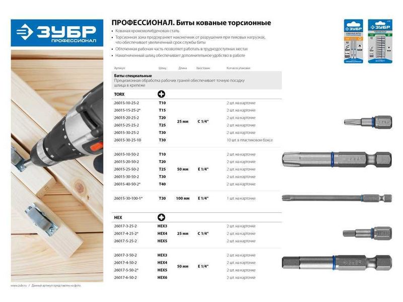 Профессиональные биты ЗУБР предназначенные для монтажа и демонтажа резьбовых соединений, имеют тор-сионную зону, предохраняющую нако-нечник от разрушения при пиковых нагрузках. Используются с ручным и механизированным инструментом.