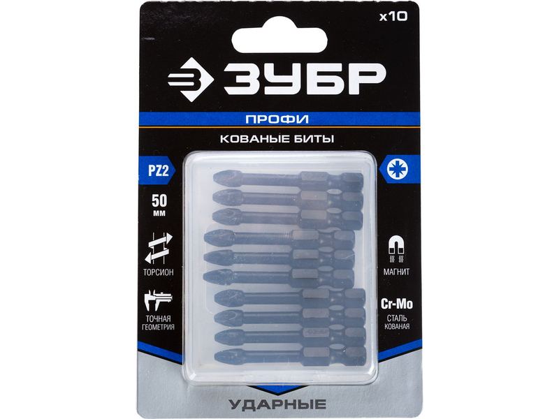 Биты ЗУБР "ПРОФИ" Pozidrive, тип хвостовика E 1/4", PZ2, 50мм, 10шт, в пластиковом боксе, на карточке -595