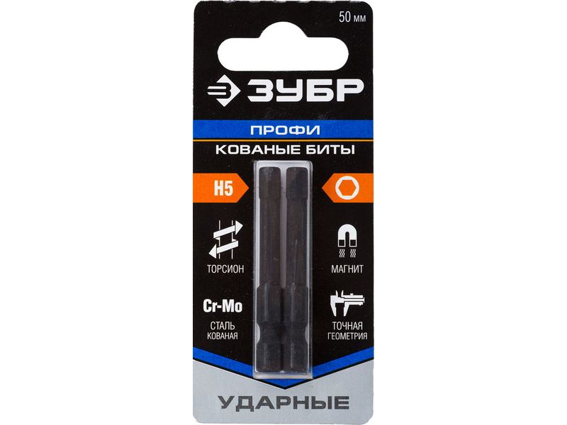 Биты ЗУБР ПРОФИ HEX5, тип хвостовика E 1/4, 50мм, 2шт, на карточке Профессиональные кованые ударные кованые биты ЗУБР - надежные комплектующие для ударных шуруповертов предназначены для монтажа и демонтажа резьбовых соединений.