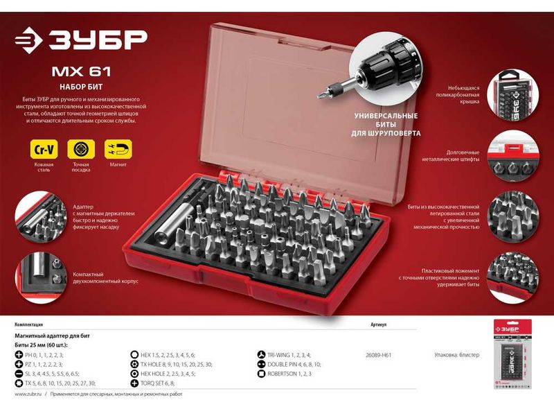 Купить Набор ЗУБР "МАСТЕР": Биты "МХ-61", Cr-V в боксе