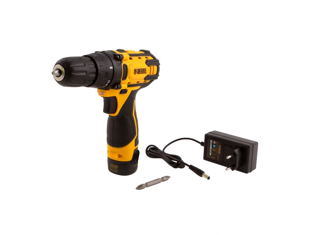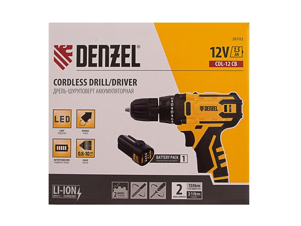 Аккумуляторная дрель-шуруповерт Denzel CDL-12CB 26102 с батареей Li-Ion 12 В предназначена для монтажа и демонтажа резьбовых соединений, сверления отверстий в металле (до 10 мм), древесине (до 16 мм), пластмассе и других материалах. Инструмент пригодится профессионалам и любителям на строительной площадке, дома или на даче.,Надежный литий-ионный аккумулятор без эффекта памяти обеспечивает долгий срок службы инструмента. Дрель не зависит от сети питания, что делает удобной работу на строительных объектах, на высоте и в отдаленных участках дома.