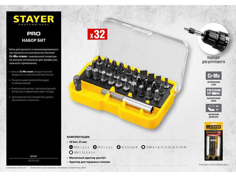 Набор STAYER "PROFI": Биты Cr-Mo, в компактном боксе. 32 предмета