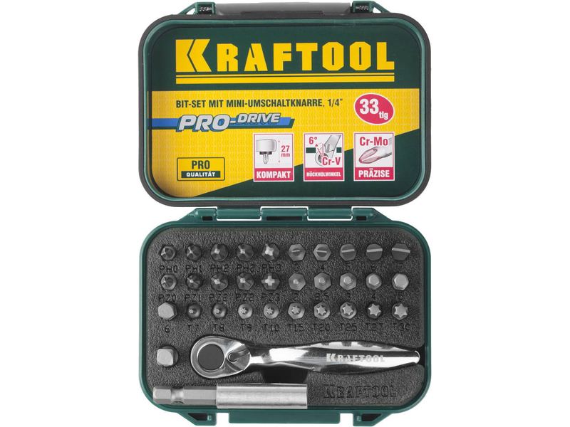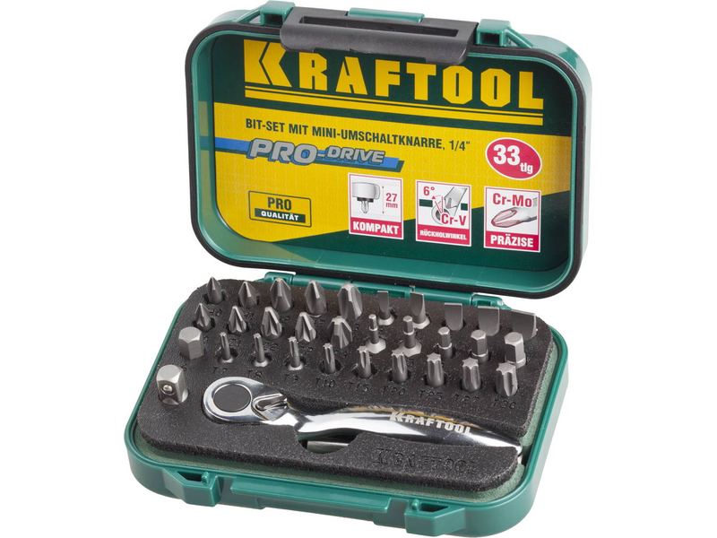 Набор бит с мини-трещоткой KRAFTOOL серии «PRO» предназначен для профессионального применения.