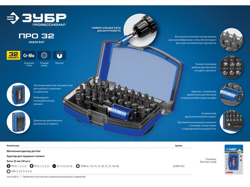 Купить Набор ЗУБР: Биты "ПРО-32", CR-Mo, в боксе