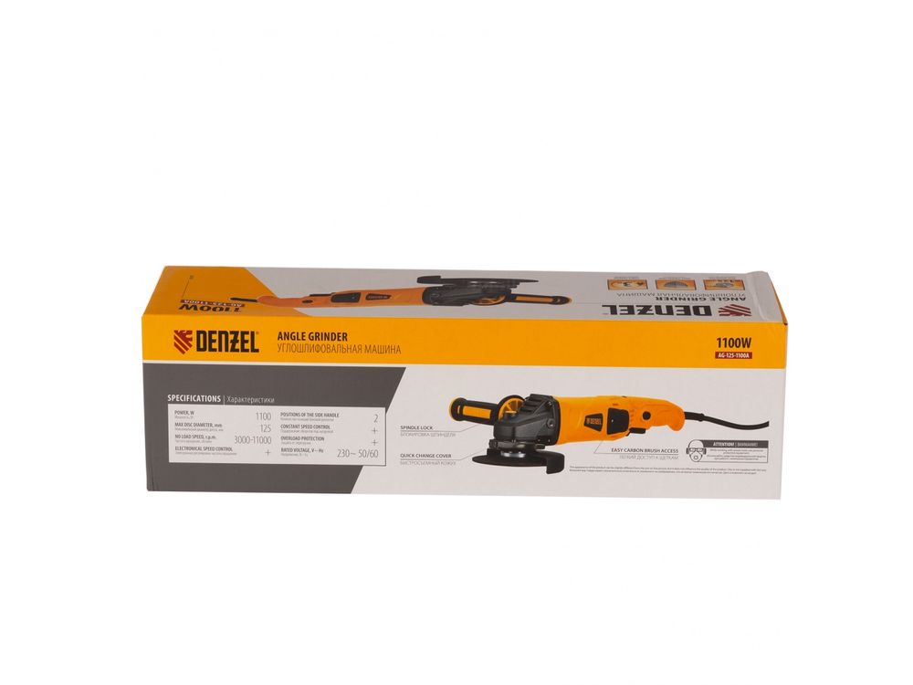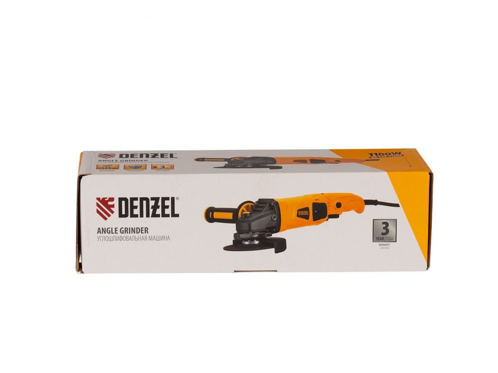 Угловая шлифовальная машина Denzel AG125-1100A 26908 мощностью 1100 Вт совместима с насадками максимальным диаметром 125 мм, поддерживает частоту вращения шпинделя от 3000 до 11000 об/мин, благодаря чему эффективно справляется с обработкой и зачисткой поверхностей, а также резкой, шлифовкой металла толщиной до 35 мм и камня. Пригодится дома, в гараже и на даче.