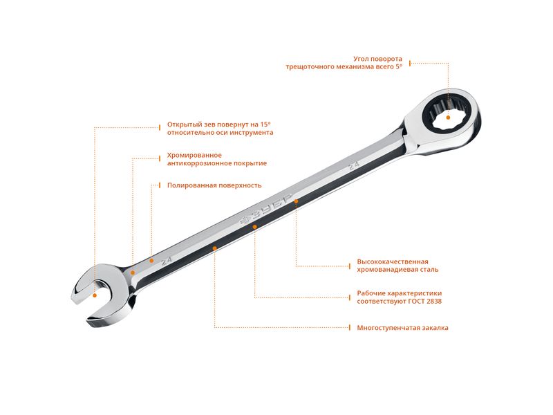Комбинированный гаечный ключ трещоточный 24 мм, ЗУБР-343