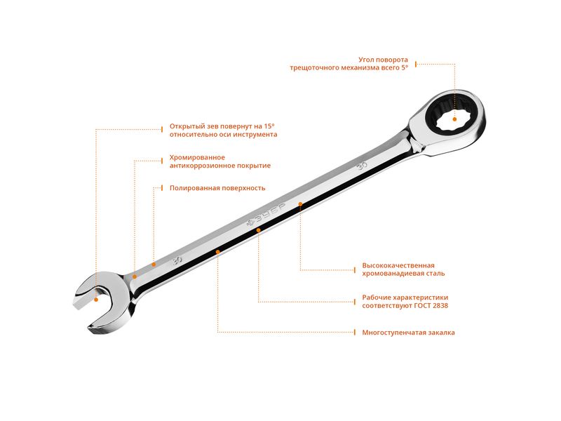 Комбинированный гаечный ключ трещоточный 30 мм, ЗУБР-343