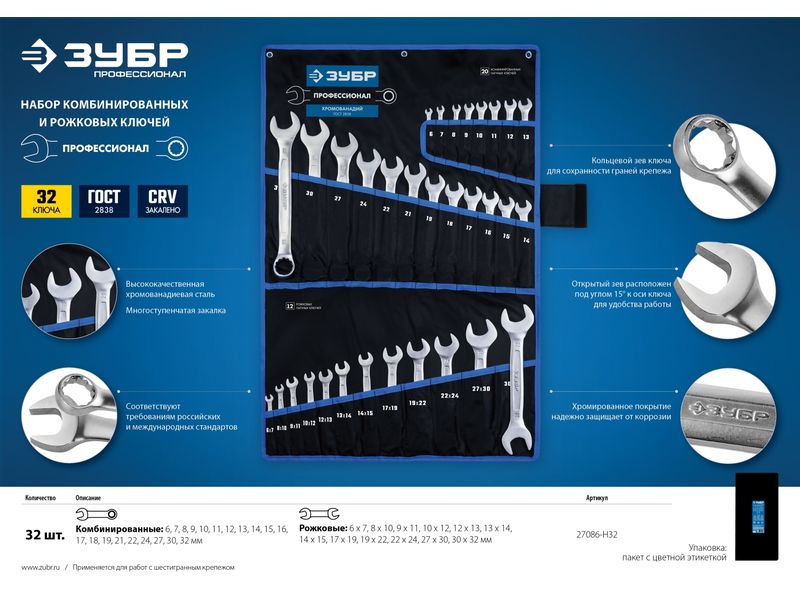 Набор комбинированных и рожковых гаечных ключей 32 шт, 6 - 32 мм, ЗУБР-343
