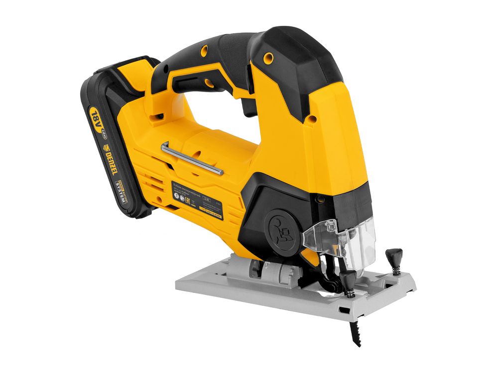 Аккумуляторный лобзик Denzel CJ-80 27201 работает от источника питания Li-Ion с рабочим напряжением 18 В, емкостью 2 А·ч. Предназначен для прямого и фигурного реза листовых материалов из древесины и пластмассы, а также металлических заготовок, ламината, ДСП, ДВП. Максимальная глубина пропила деревянных материалов составляет 80 мм, алюминиевых — 12 мм, стальных — 5 мм. Мощный двигатель позволяет развивать скорость движения оснастки до 2400 ход/мин, что обеспечивает высокую производительность.