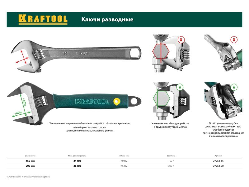 Профессиональные разводные ключи Kraftool изготовлены из высококачественной хромованадиевой стали, соответствуют самым высоким техническим требованиям, фосфатированное покрытие защищает от коррозии. Обладают повышенным ресурсом и обеспечивают длительную и качественную работу при монтаже и демонтаже резьбовых соединений.