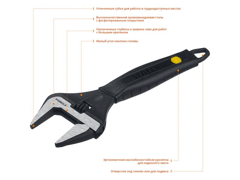 Профессиональные разводные ключи STAYER предназначены для завинчивания гаек, болтов и других деталей, изготовлены из высококачественной хромованадиевой стали, снабжены миллиметровой измерительной шкалой, а, благодаря наличию тонких губок, инструмент удобен для выполнения работ в труднодоступных местах.