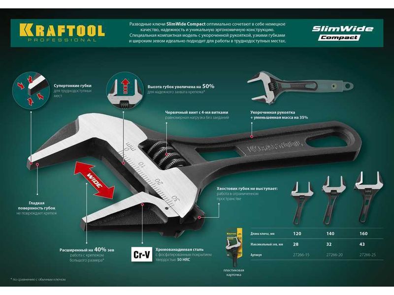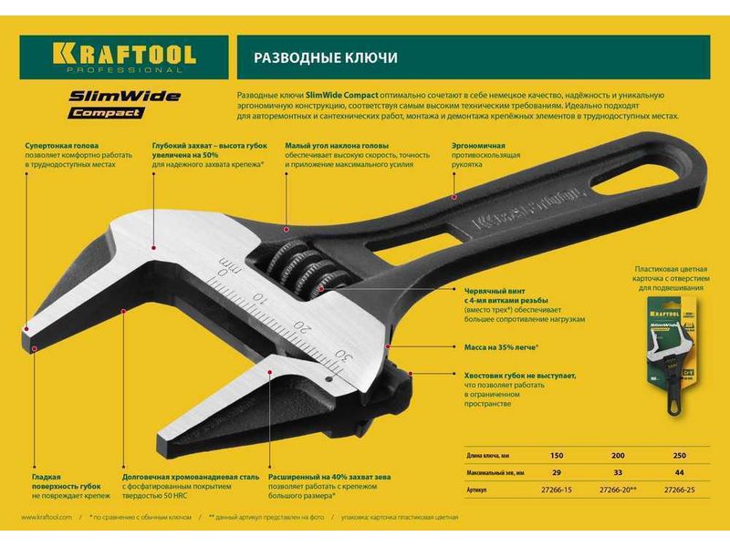 Профессиональные разводные ключи KRAFTOOL – оптимальное сочетание высочайшего качества, надёжности и привлекательного эргономичного дизайна. Изготовлены из высококачественной хромованадиевой стали с фосфатированным покрытием, закалены до твердости 50 HRC, имеют уникальную конструкцию и соответствуют самым высоким техническим требованиям. Идеально подходят для авторемонтных и сантехнических работ, обслуживания климатического и производственного оборудования
