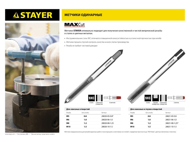 Метчик STAYER MASTER оптимально подходит для получения качественной и чистой резьбы в сквозных и глухих отверстиях в сталях и цветных металлах