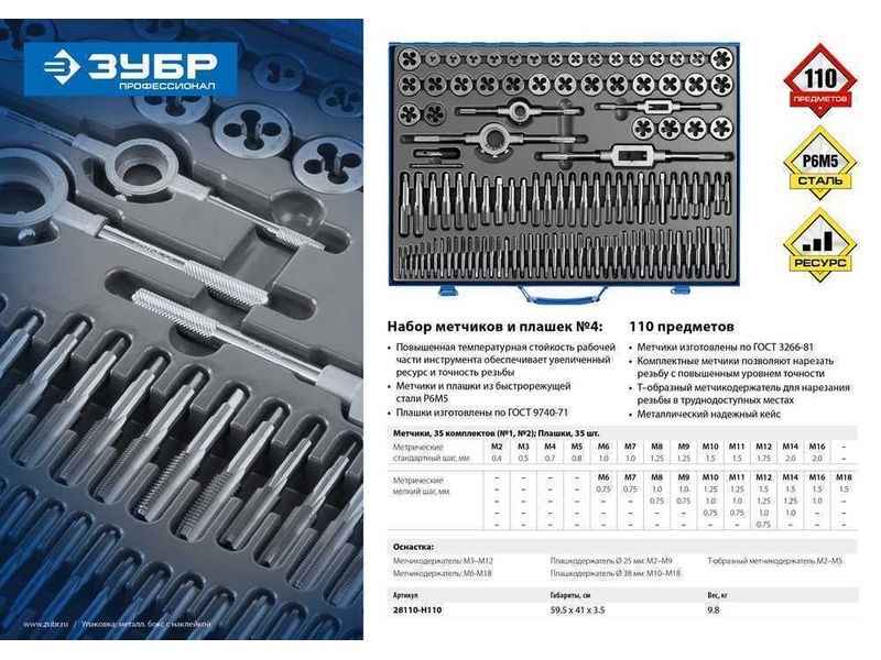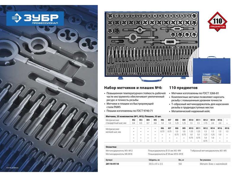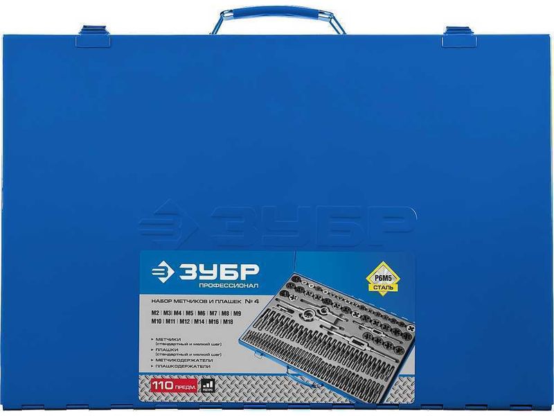 Набор метчиков и плашек ЗУБР ПРОФЕССИОНАЛ , сталь Р6М5, 110 предметов