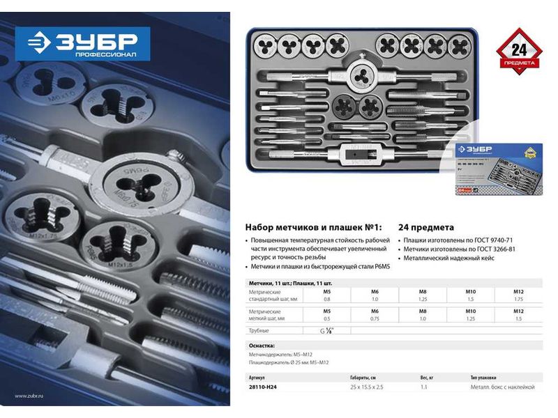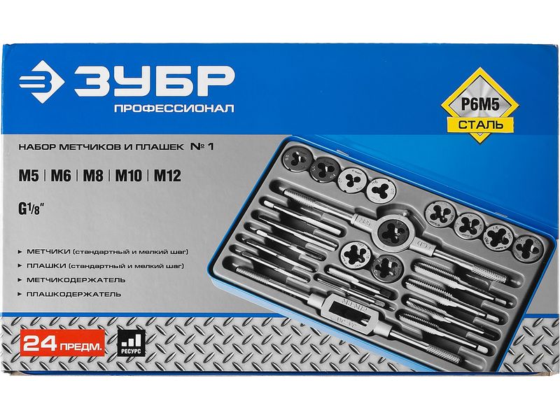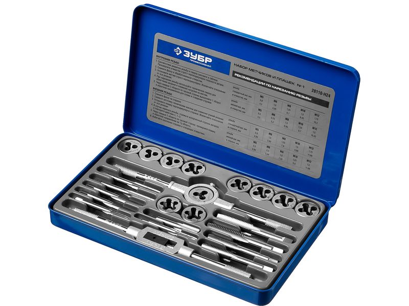 Набор метчиков и плашек ЗУБР ПРОФЕССИОНАЛ , сталь Р6М5, 24 предмета