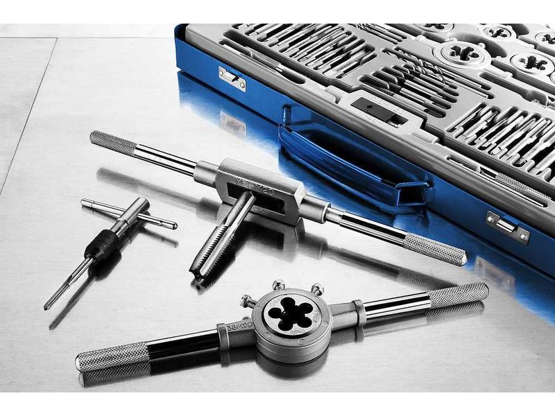 Набор предназначен для нарезания и калибрования внутренней и внешней метрической и трубной резьбы в сквозных и глухих отверстиях в сталях с пределом прочности до 900Н/мм2, цветных металлах, пластике.