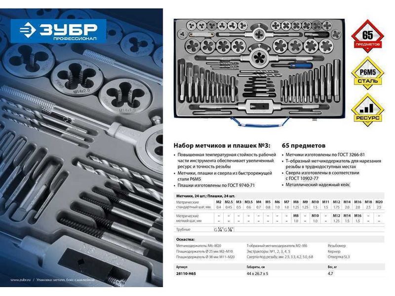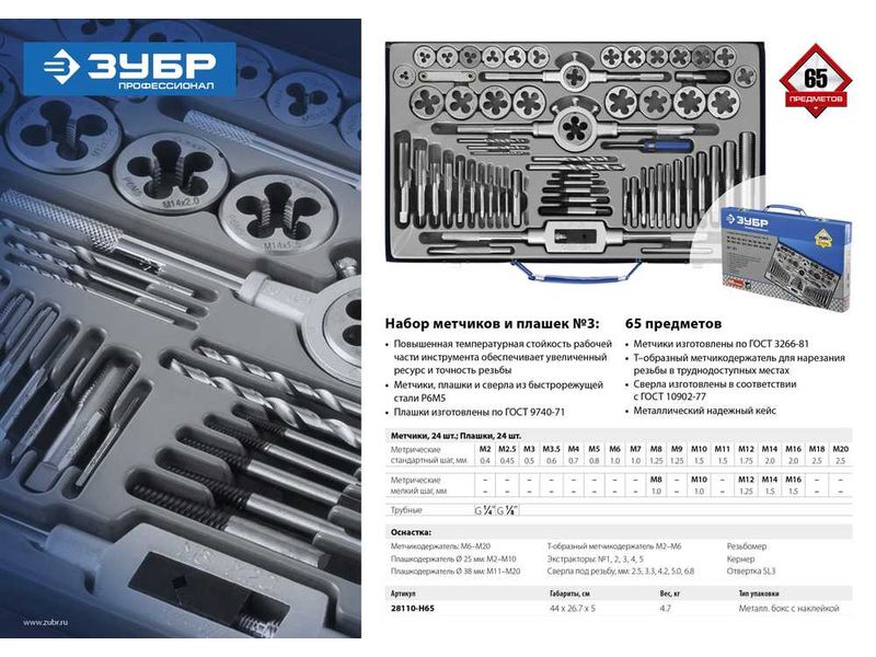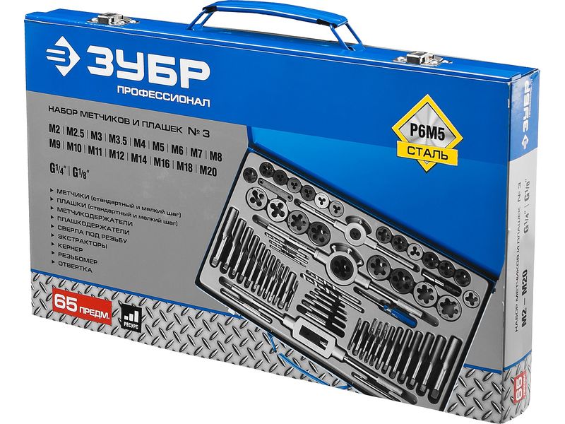 Набор метчиков и плашек ЗУБР ПРОФЕССИОНАЛ , сталь Р6М5, 65 предметов