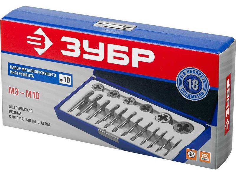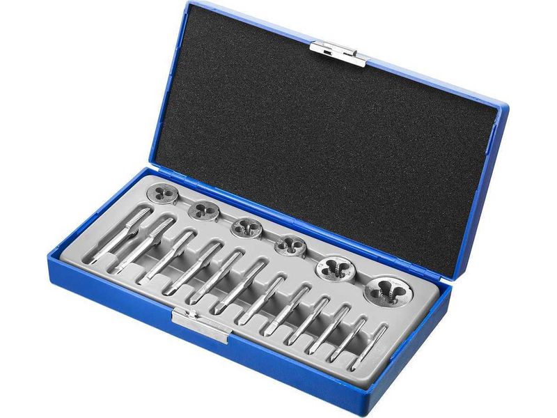 Набор предназначен для резьбонарезных работ в конструкциях и заготовках из сталей и цветных металлов. Метчики ручные однопроходные используются для нарезания внутренней метрической резьбы с нормальным шагом в глухих и сквозных отверстиях. Плашки предназначены для нарезания внешней метрической резьбы с нормальным шагом.