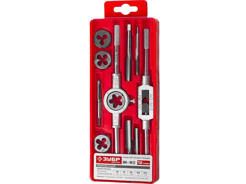 Купить Набор ЗУБР "МАСТЕР" с металлореж. Инстр., метчики однопроходные и плашки М6-М12, оснастка - в пластиковом боксе, 12пред.