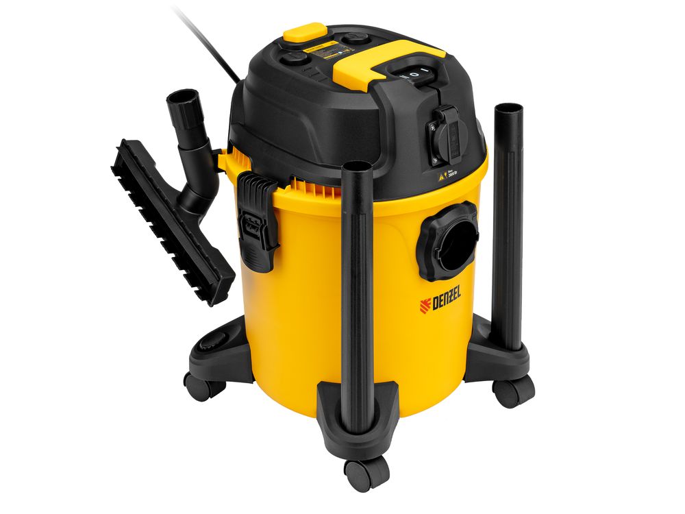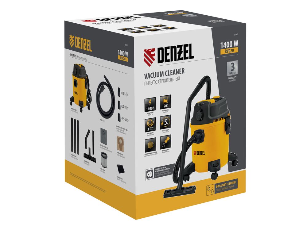 Пылесос строительный Denzel RVC20 28202 мощностью 1400 Вт, с баком объемом 20 л и шлангом длиной 3 м, оснащен розеткой с автосинхронизацией и предназначен для уборки бетонной, кирпичной пыли, опилок, стружки, также предусмотрена функция сбора воды. К пылесосу можно подключить электроинструмент, чтобы минимизировать количество пыли, образующейся в результате пиления, сверления, фрезерования. Техника используется во время проведения строительных и ремонтных работ, будет полезна для поддержания чистоты в мастерской, гараже, производственном помещении.