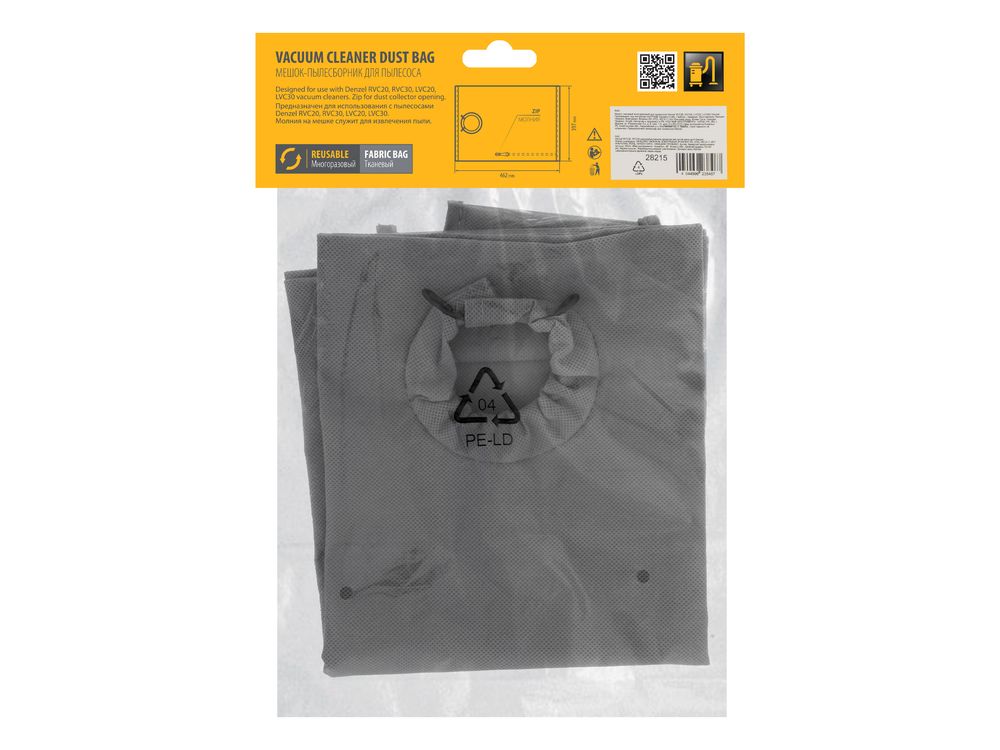 Многоразовый тканевый мешок Denzel 28215 — сменный аксессуар для строительных пылесосов RVC20 (28202), RVC30 (28203), LVC20 (28292), LVC30 (28293). Устанавливается в бак пылесоса и служит для сбора мусора во время сухой уборки.