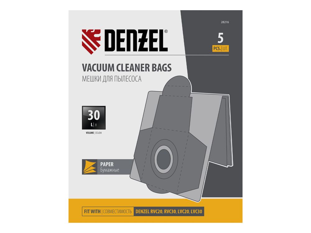 Комплект одноразовых мешков Denzel 28216 представляет собой набор из 5 расходников для строительных пылесосов RVC20 (28202), RVC30 (28203), LVC20 (28292), LVC30 (28293). Мешок объемом 30 л устанавливается в специальное гнездо с внутренней стороны бака и служит для сбора мусора во время сухой уборки.