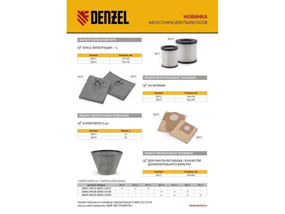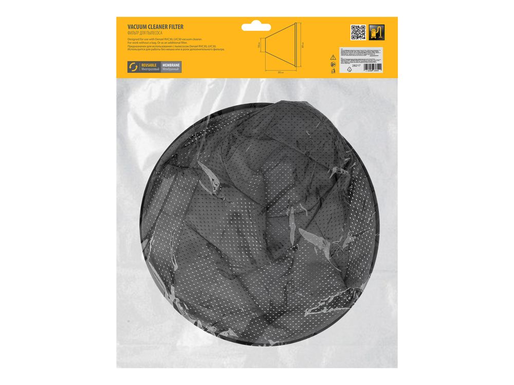 Мембранный тканевый фильтр Denzel 28217 совместим со строительными пылесосами RVC30 (28203), LVC30 (28293). Устанавливается в бак пылесоса и служит для дополнительной фильтрации, а также позволяет проводить сухую уборку без использования мешка.