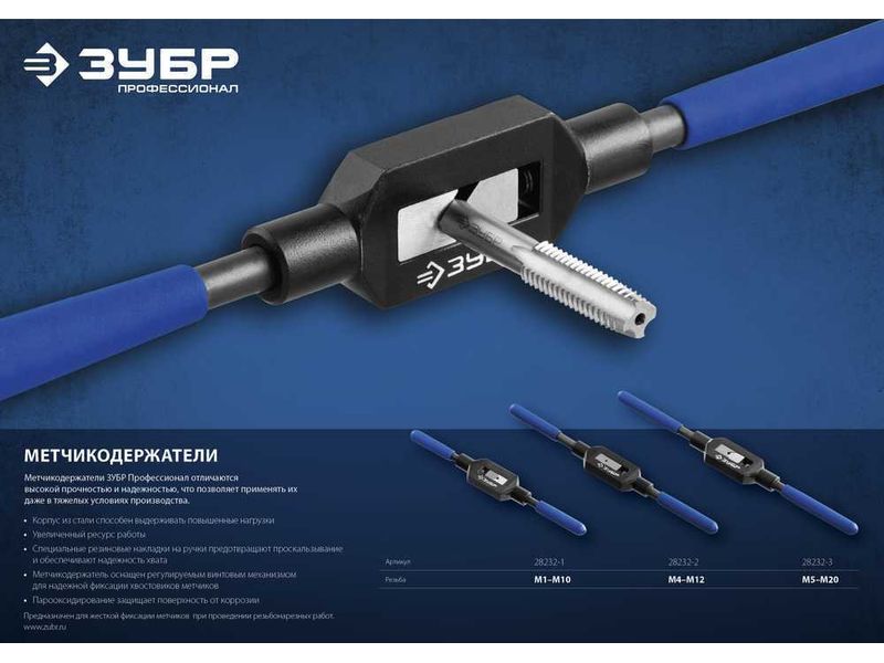 Метчикодержатели ЗУБР ПРОФЕССИОНАЛ отличаются высокой прочностью, что позволяет применять их даже в тяжелых условиях производства