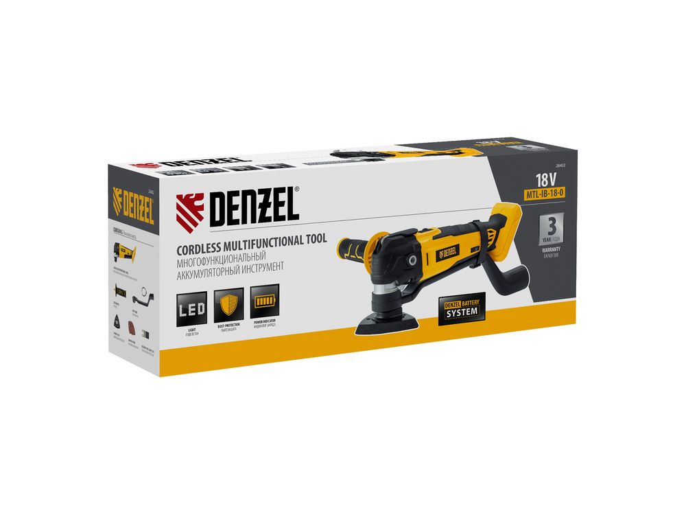 Многофункциональный аккумуляторный инструмент Denzel MTL-IB-18-0 28402 предназначен для выполнения широкого спектра задач. Позволяет осуществлять распил, подрезание, зачистку, обдирку практически любых материалов, например, древесины, металла, керамики. С высокой эффективностью работает даже в местах, недоступных для обычного лобзика и шлифовальной машины.,Инструмент работает от универсального аккумулятора Li-Ion напряжением 18 В и емкостью 2 Ач, который подходит ко всем инструментам Denzel на платформе 18 В. Аккумулятор Denzel имеет защиту от глубокого разряда и перезаряда, обеспечивает не только автономность инструмента, но и высокие технические характеристики (аккумулятор и зарядное устройство приобретаются отдельно).
