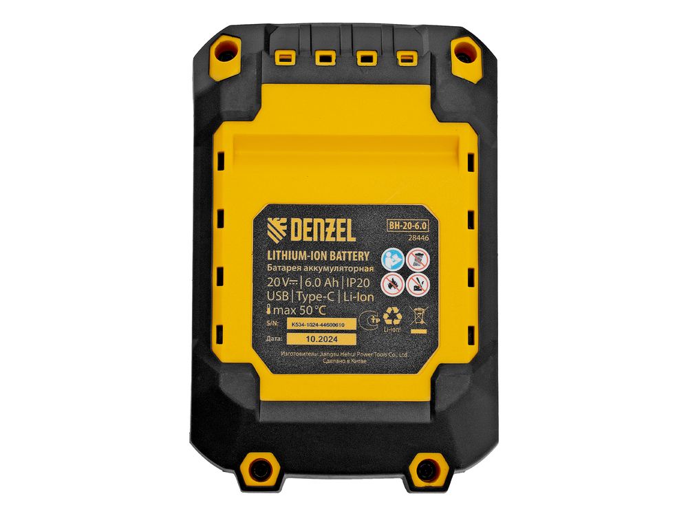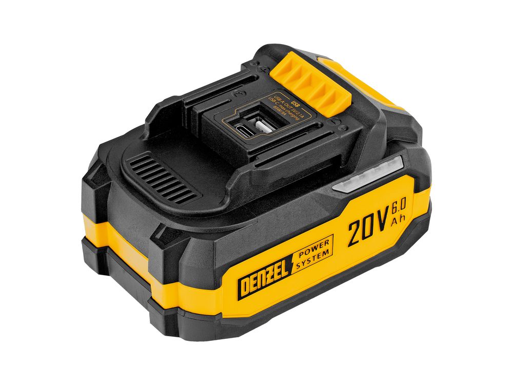 Батарея Li-Ion Denzel BH-20-6.0 28446 номинальным напряжением 20 В и емкостью 6,0 А·ч обеспечивает работоспособность аккумуляторного инструмента. Подходит для всех инструментов единой платформы Denzel Power System 20V. Также может использоваться в качестве зарядного устройства для мобильных устройств, поддерживающих зарядку от разъемов USB 3.0 (USB-A) и USB Type-C.