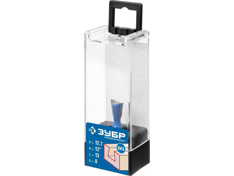 Фреза пазовая фасонная "Ласточкин Хвост", D- 12,7мм, рабочая длина-13мм, обратный угол-12 градусов, хв.-8 мм, ЗУБР Профессионал |
