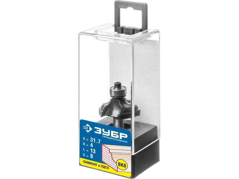 Фреза ЗУБР ПРОФЕССИОНАЛ кромочная калевочная №3, диаметр-31.7 мм, рабочая длина-13 мм, радиус-4 мм, хвостовик-8 мм, диаметр подшипника-12,7 мм-1852