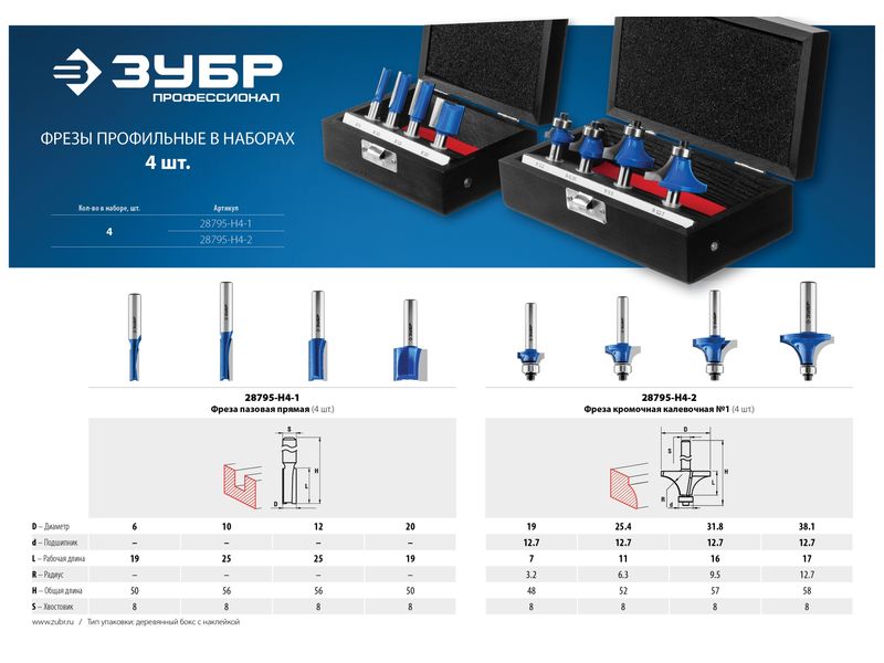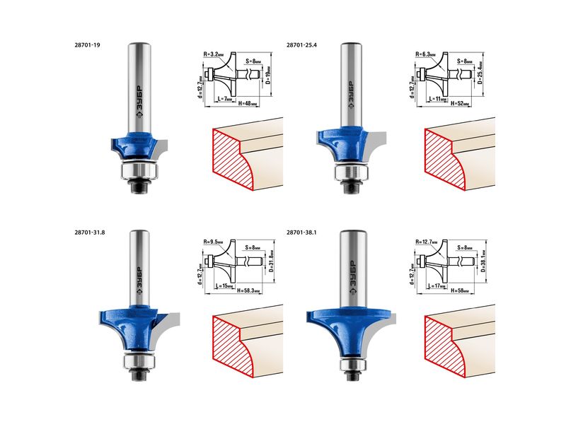 Набор профильных фрез по дереву ЗУБР ПРОФЕССИОНАЛ, 4 шт-1852