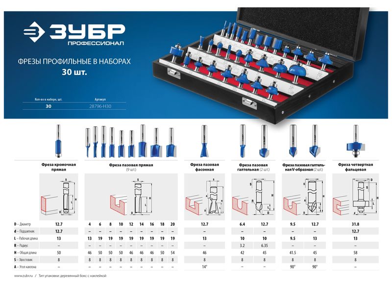 Набор профильных фрез по дереву ЗУБР ПРОФЕССИОНАЛ, 30 шт-1852