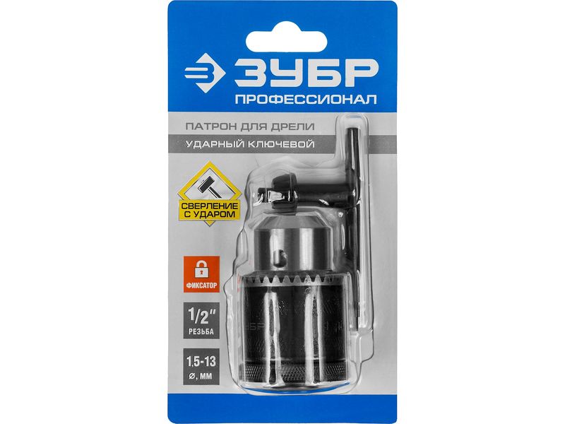 Патрон ударный ключевой, ЗУБР Профессионал 29082-13-1/2, 13мм, посадочная резьба 1/2", с фиксатором на шпинделе, D 1,5-13мм |