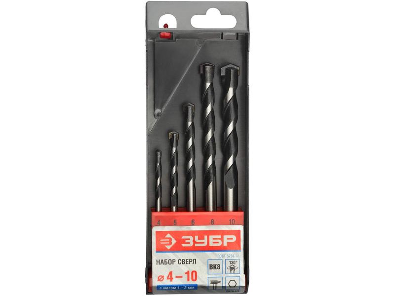 Набор ЗУБР Свёрла "СУПЕР-6" по бетону, ударные, с шестигранным хвостовиком, 4; 5; 6; 8; 10мм, 5шт