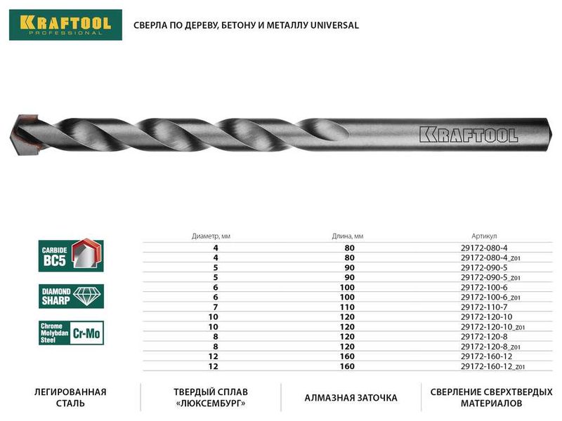 KRAFTOOL UNIVERSAL 10 х 120 мм сверло универсальное по металлу, бетону, кирпичу, керамике PROFESSIONAL