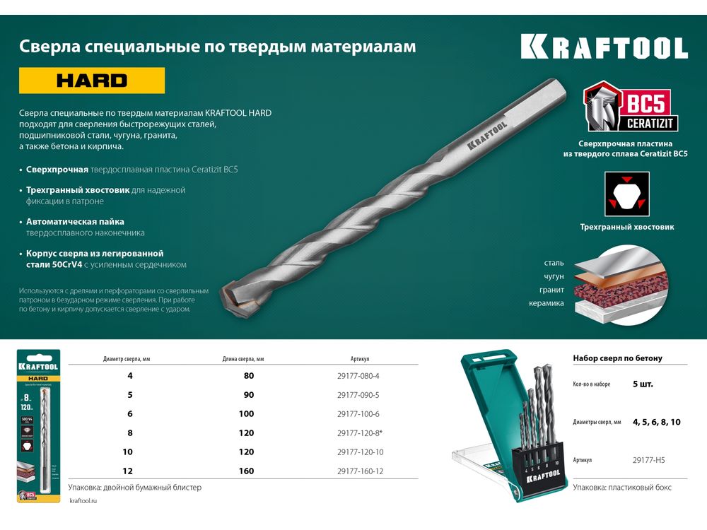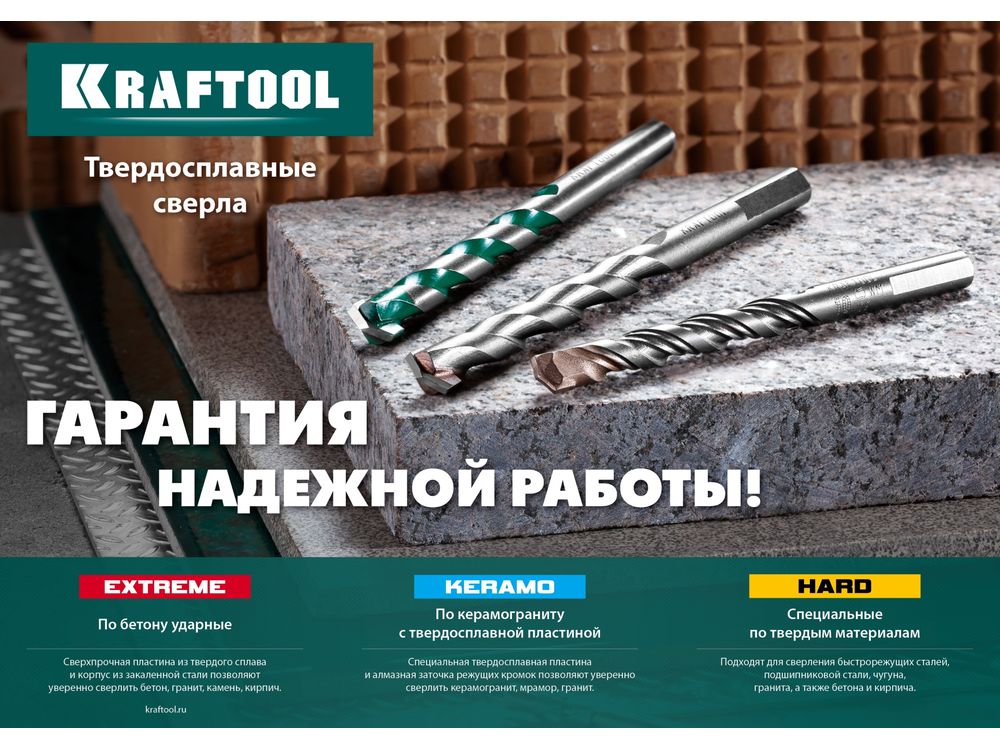 Сверла специальные HARD по твёрдым материалам подходят для сверления быстрорежущих сталей, подшипниковой стали, чугуна, керамики, гранита, а также бетона и кирпича.
