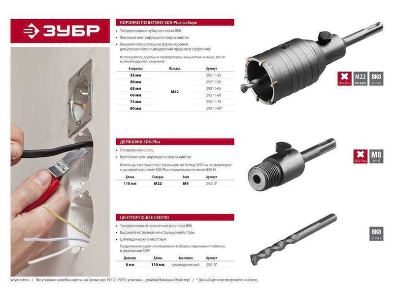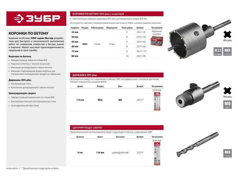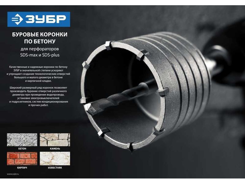 Коронки по бетону используются совместно с державками и центрирующими сверлами. Широкий ассортимент оснастки ЗУБР позволяет реализовать самые сложные задачи в работе по бетону, камню и кирпичу.