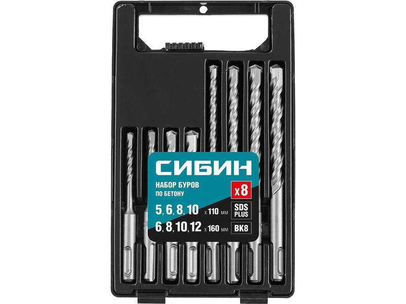 СИБИН Набор буров по бетону SDS-plus 8 шт: 5 х 110, 6 х 110, 8 х 110, 10 х 110, 6 х 160, 8 х 160, 10 х 160, 12 х 160 мм-416