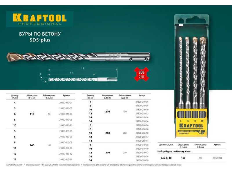 Буры по бетону SDS-Plus KRAFTOOL серии EXPERT - сила и точность там, где они нужны. Применяются при сверлении отверстий в бетоне, граните, кирпичной кладке, камне и твердых известняках.